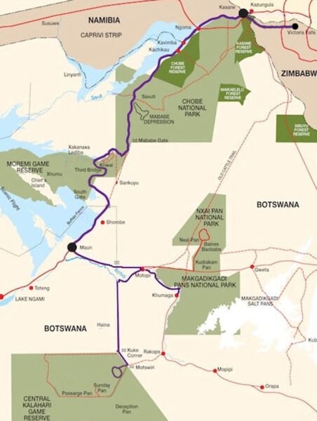 Die Reise führt Sie zuerst in die unberührte Natur der Kalahari mit einer einzigartigen Tierwelt. Über die Salzebenen und Steppen des Makgadikgadi Nationalparks geht es zurück nach Maun, wo optional ein Rundflug über das Okavango-Delta angeboten wird. Sie erkunden den südlichen Teil des Delta mit seinen Wasserläufen und Inseln einem Tag lang mit Mokoros (Einbaumboote) und auf Wanderungen. Das Moremi Game Reserve im östlichen Bereich des Deltas zählt als das schönste Schutzgebiet in Botswana. Hier erleben Sie erstaunlichen Tierreichtum. Über den Chobe Nationalpark geht die Reise bis zu den beeindruckenden Victoria-Wasserfällen.
